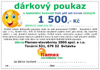 Pokud chcete udělat radost svým blízkým, nebo přátelům, můžete si náš dárkový poukaz jednoduše u nás koupit v námi nabízené nominální hodnotě 500,- Kč , 1 000,-Kč, 1 500,- Kč, 2 000,-Kč nebo 5 000,- Kč. Držiteli tohoto dárkového poukazu bude na naší provozovně FLAMEX - Stavebniny 2000 spol. s r.o. Tovární 531, 679 32 Svitávka bezplatně vydáno zboží jako dárek, dle vlastního výběru z naší celé aktuální skladové nabídky. Držitel tohoto dárkového poukazu může využít tento dárkový poukaz také pro uplatnění slevy na zboží nebo naše služby z naší aktuální nabídky. Hodnota dárku nebo výše slevy se rovná nominální hodnotě tohoto poukazu.